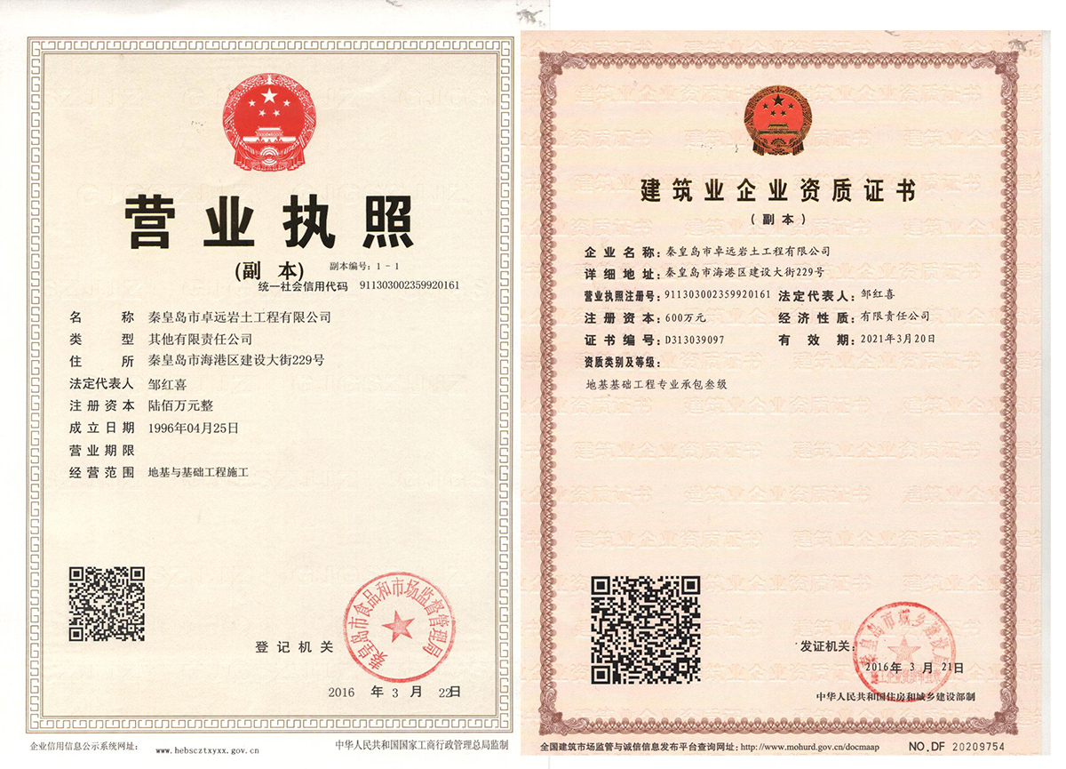 秦皇島市卓遠巖土工程有限公司成立于1996年4月,是較旱在秦市從事巖土工程施工的單位之一,擁有碩士生3人、高級工程師4人、國家注冊巖土工程師3人、項目經理5人、巖土工程師15人、市建委專家2人、預算師2人、機械師2人。擁有強夯機1臺、水準儀2臺、全站儀2臺、夯擴機2臺、長螺旋樁機2臺。